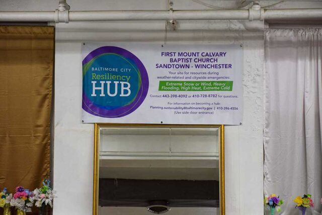 A Baltimore City Community Resiliency Hub (CRH) poster hangs at First Mount Calvary Baptist Church, a similar banner highlights each CRH location as being a resource for extreme weather. (Photo by Maya Pottiger | University of Maryland)